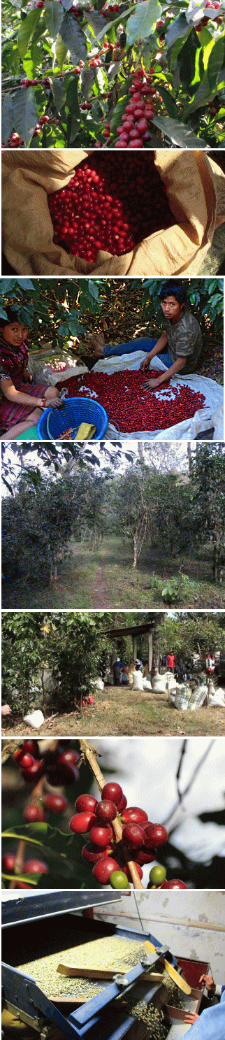 ドライ:グァテマラシティ近郊の輸出業者のミルにて、粗選別→脱殻→風力選別→スクリーン選別→比重選別→電子選別